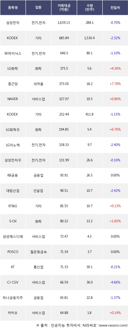 LG화학, 종근당, NAVER 등은 전일 대비 주가가 상승했고, 삼성전자, KODEX 200선물인버스2X, SK하이닉스 등은 주가가 하락했다.
