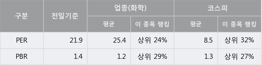 전일 종가를 기준으로 이 종목의 PER는 21.9배, PBR은 1.4배이다. PER는 화학업종의 평균 PER 25.4배 대비 -3.5배 낮은 수준으로 업종 내에서 상위 24%에 있고, PBR은 화학업종의 평균 PBR 1.2배 대비 +0.2배 높은 수준으로 업종 내에서 상위 29%에 위치한다.