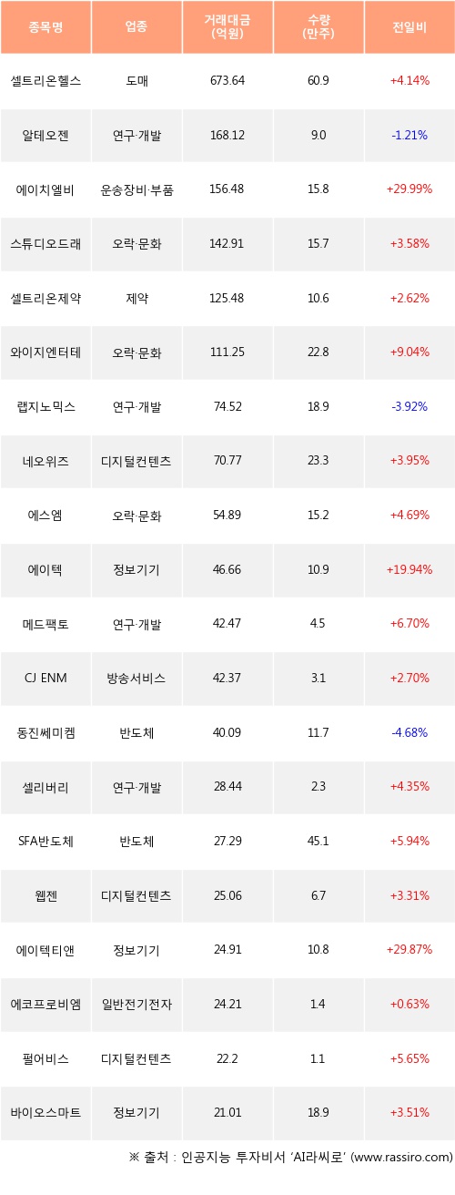 셀트리온헬스케어, 에이치엘비, 스튜디오드래곤 등은 전일 대비 주가가 상승했고, 알테오젠, 랩지노믹스, 동진쎄미켐 등은 주가가 하락했다.