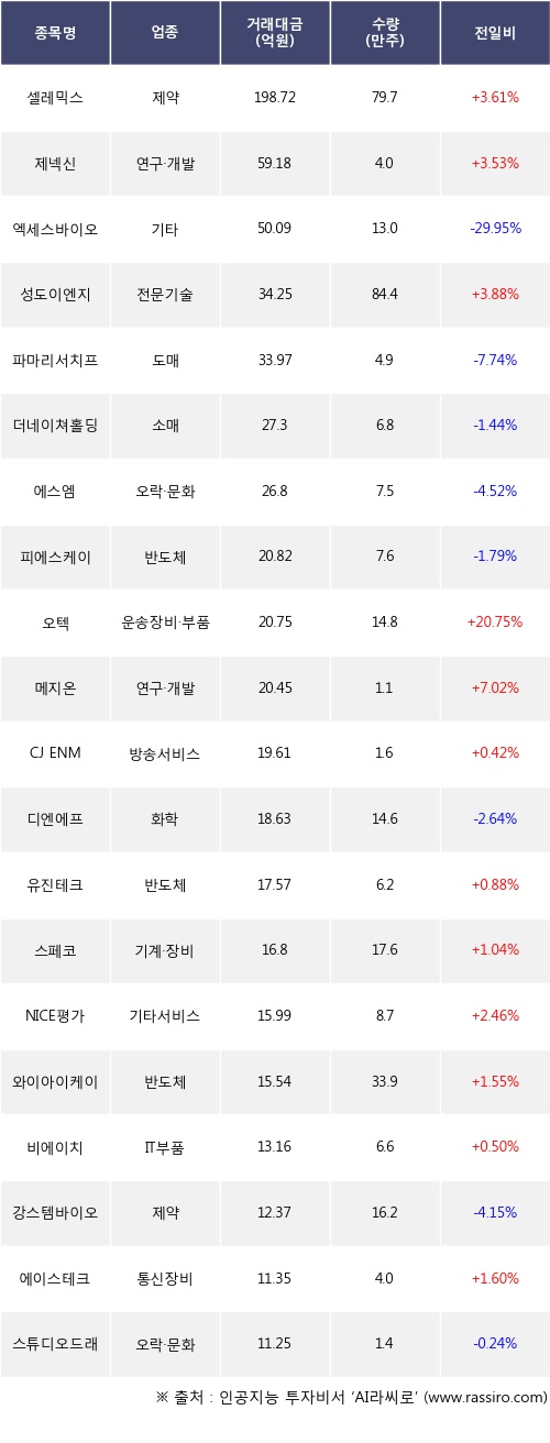 기관 투자자의 순매도 상위 20개 종목은 셀레믹스, 제넥신, 엑세스바이오, 성도이엔지, 파마리서치프로덕트, 더네이쳐홀딩스, 에스엠, 피에스케이, 오텍, 메지온등이다.