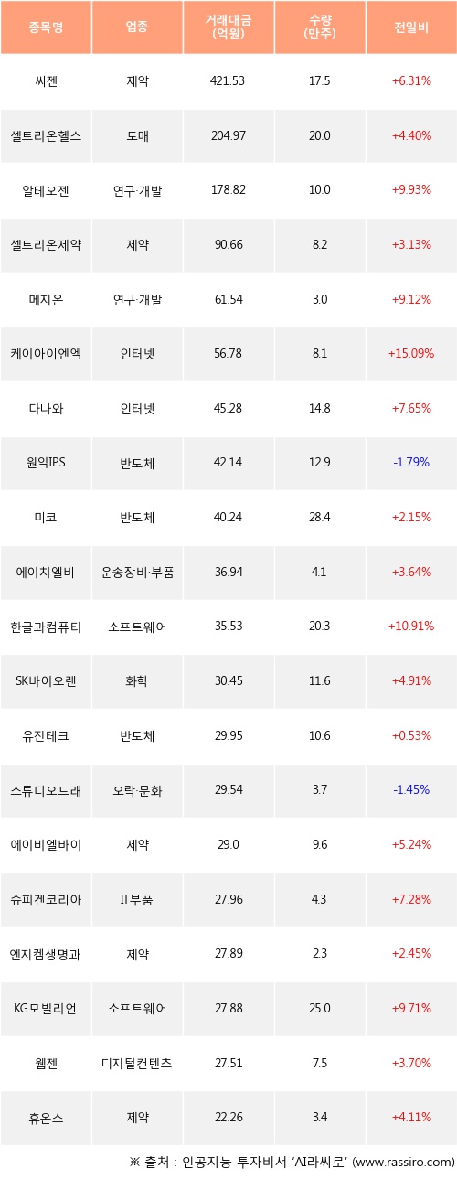 씨젠, 셀트리온헬스케어, 알테오젠 등은 전일 대비 주가가 상승했고, 원익IPS, 스튜디오드래곤 등은 주가가 하락했다.
