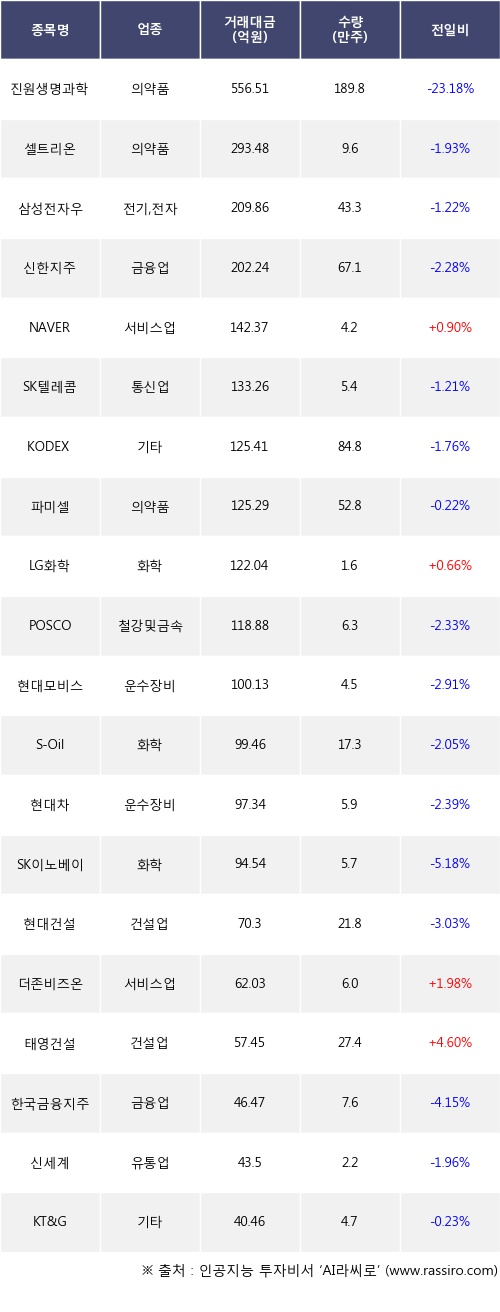 외국인 투자자의 순매도 상위 20개 종목은 진원생명과학, 셀트리온, 삼성전자우, 신한지주, NAVER, SK텔레콤, KODEX 레버리지, 파미셀, LG화학, POSCO등이다.