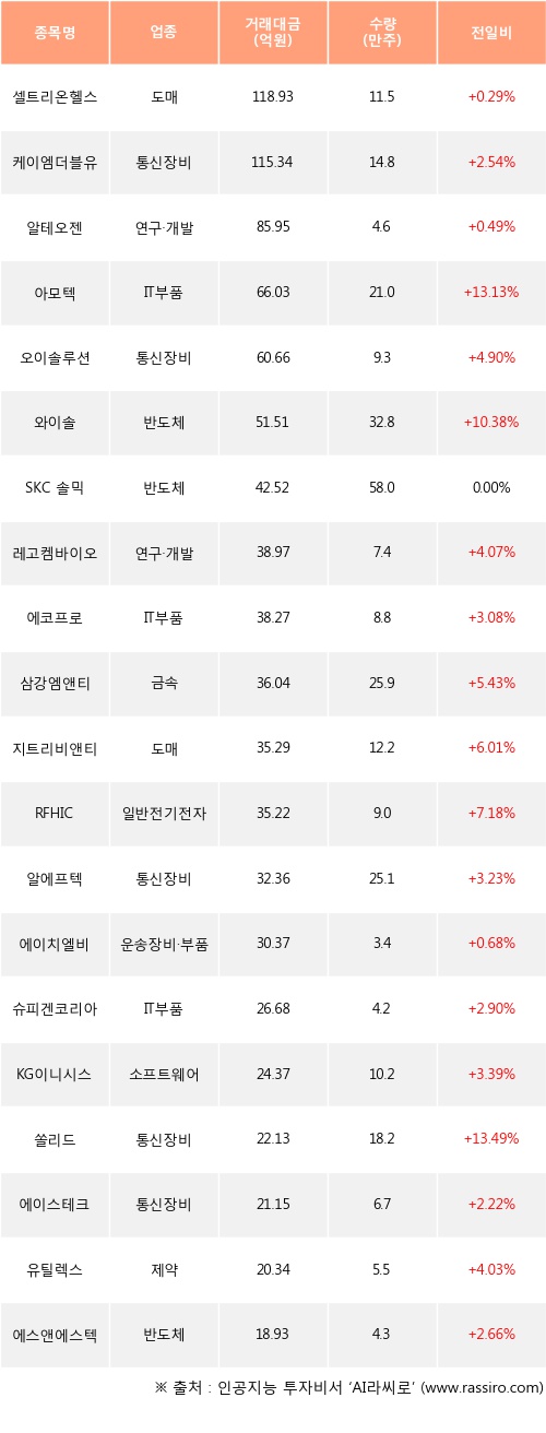 기관 투자자의 순매수 상위 20개 종목은 셀트리온헬스케어, 케이엠더블유, 알테오젠, 아모텍, 오이솔루션, 와이솔, SKC 솔믹스, 레고켐바이오, 에코프로, 삼강엠앤티등이다.