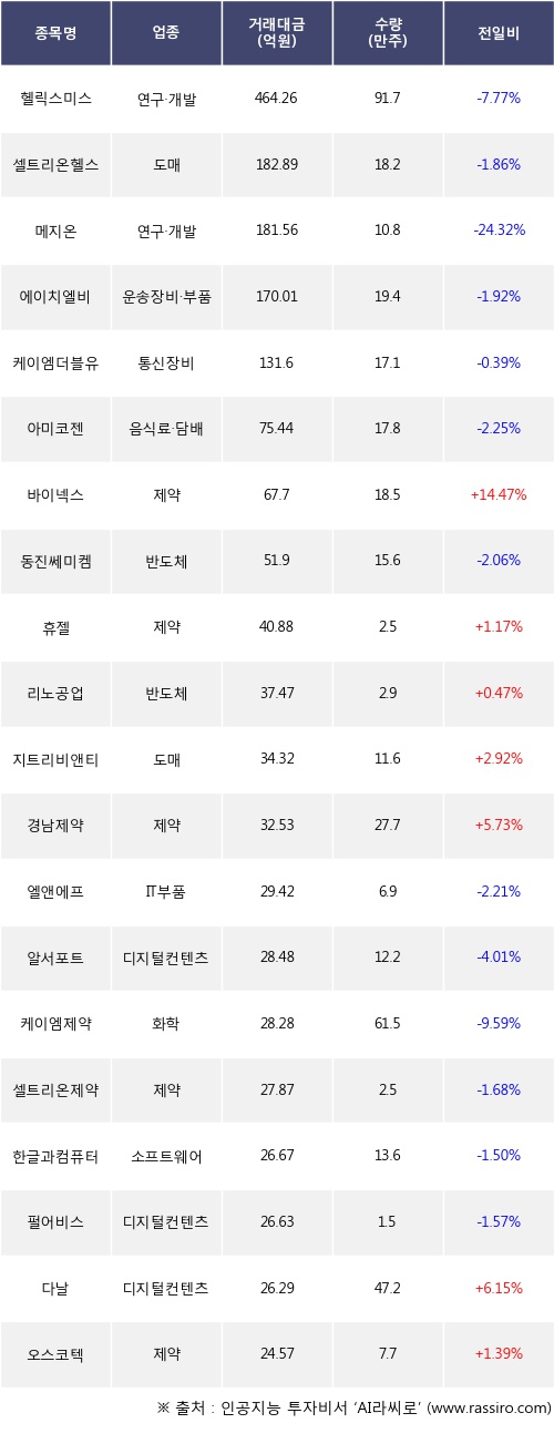 외국인 투자자의 순매도 상위 20개 종목은 헬릭스미스, 셀트리온헬스케어, 메지온, 에이치엘비, 케이엠더블유, 아미코젠, 바이넥스, 동진쎄미켐, 휴젤, 리노공업등이다.