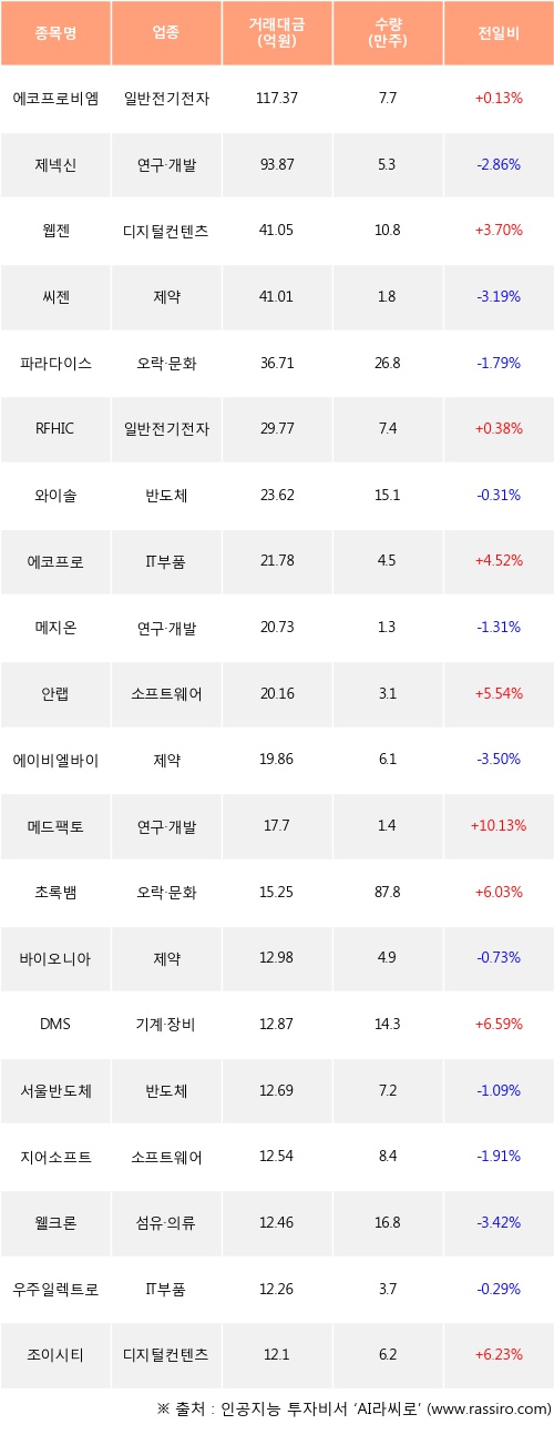 에코프로비엠, 웹젠, RFHIC 등은 전일 대비 주가가 상승했고, 제넥신, 씨젠, 파라다이스 등은 주가가 하락했다.