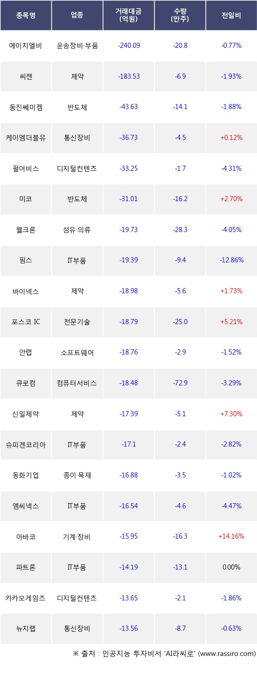 외국인 투자자의 순매도 상위 20개 종목은 에이치엘비, 씨젠, 동진쎄미켐, 케이엠더블유, 펄어비스, 미코, 웰크론, 핌스, 바이넥스, 포스코 ICT등이다.