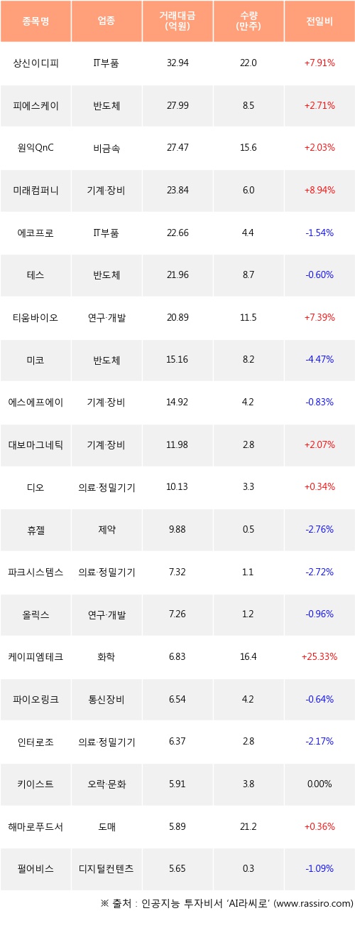 기관 투자자의 순매수 상위 20개 종목은 상신이디피, 피에스케이, 원익QnC, 미래컴퍼니, 에코프로, 테스, 티움바이오, 미코, 에스에프에이, 대보마그네틱등이다.