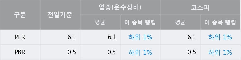 전일 종가를 기준으로 이 종목의 PER는 6.1배, PBR은 0.5배이다. PER는 운수장비업종의 평균 PER 6.1배와 동일한 수준으로 업종 내에서 하위 1%에 있고, PBR은 운수장비업종의 평균 PBR 0.5배와 동일한 수준으로 업종 내에서 하위 1%에 위치한다. 보통 낮은 PER는 현재 시장이 해당 기업의 가치를 상대적으로 낮게 평가하고 있다고 해석될 수 있다.