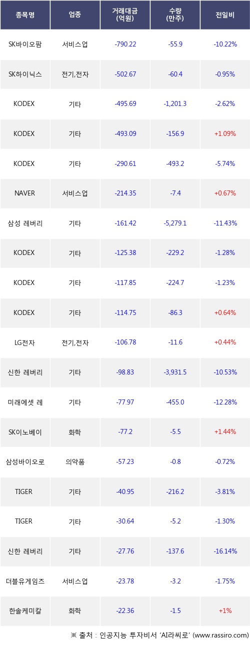기관 투자자의 순매도 상위 20개 종목은 SK바이오팜, SK하이닉스, KODEX 200선물인버스2X, KODEX 200, KODEX WTI원유선물(H), NAVER, 삼성 레버리지 WTI원유 선물 ETN, KODEX 인버스, KODEX 코스닥150선물인버스, KODEX 코스닥 150등이다.