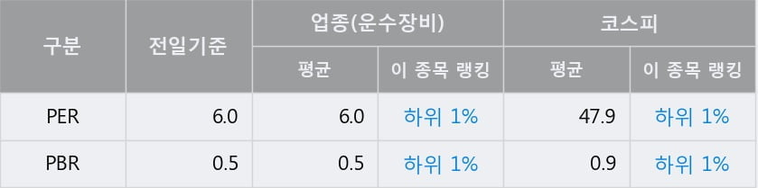 전일 종가를 기준으로 이 종목의 PER는 6.0배, PBR은 0.5배이다. PER는 운수장비업종의 평균 PER 6.0배와 동일한 수준으로 업종 내에서 하위 1%에 있고, PBR은 운수장비업종의 평균 PBR 0.5배와 동일한 수준으로 업종 내에서 하위 1%에 위치한다. 보통 낮은 PER는 현재 시장이 해당 기업의 가치를 상대적으로 낮게 평가하고 있다고 해석될 수 있다.