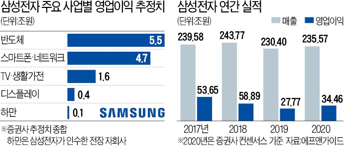 TV와 생활가전이 속해 있는 CE(소비자가전) 부문도 전 분기(7300억원)의 두 배가 넘는 1조6000억원 수준의 영업이익을 거둔 것으로 추정된다. TV사업에선 집에서 여가를 즐기는 트렌드가 확산되면서 70인치 이상 대형 TV가 잘 팔린 영향이 컸다는 분석이 나온다. 생활가전은 의류관리기, 의류건조기 등 ‘위생 가전’의 판매 급증, 맞춤형 냉장고 ‘비스포크’의 돌풍 영향으로 역대 최대 수준의 영업이익을 거뒀다. 스마트폰과 마찬가지로 CE 부문에서도 마케팅비 절감 영향이 작지 않았던 것으로 전해졌다.