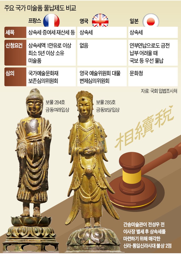 한국에서는 미술품 물납이 허용되지 않기 때문에 상속 과정에서 미술품 매각을 시도하는 경우가 많다. 간송미술관이 대표적 사례다. 결국 간송미술관의 국가지정보물 두 점은 국립중앙박물관에서 8월 매입했다. 하지만 국립중앙박물관의 문화재 구입 예산은 연간 50억원에 불과해 한계가 있다는 지적이다.