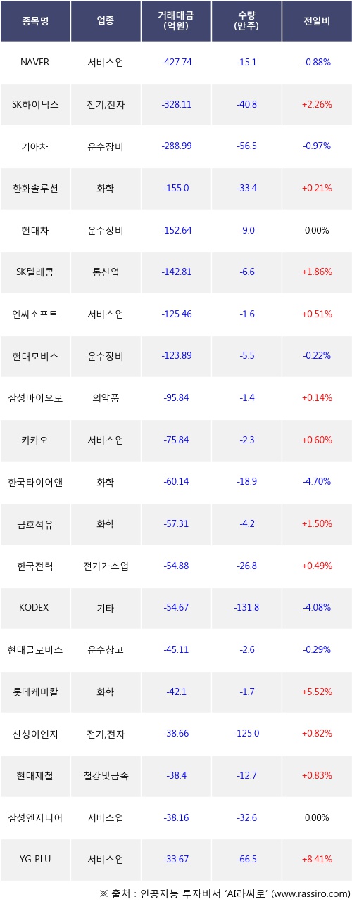 외국인 투자자의 순매도 상위 20개 종목은 NAVER, SK하이닉스, 기아차, 한화솔루션, 현대차, SK텔레콤, 엔씨소프트, 현대모비스, 삼성바이오로직스, 카카오등이다.