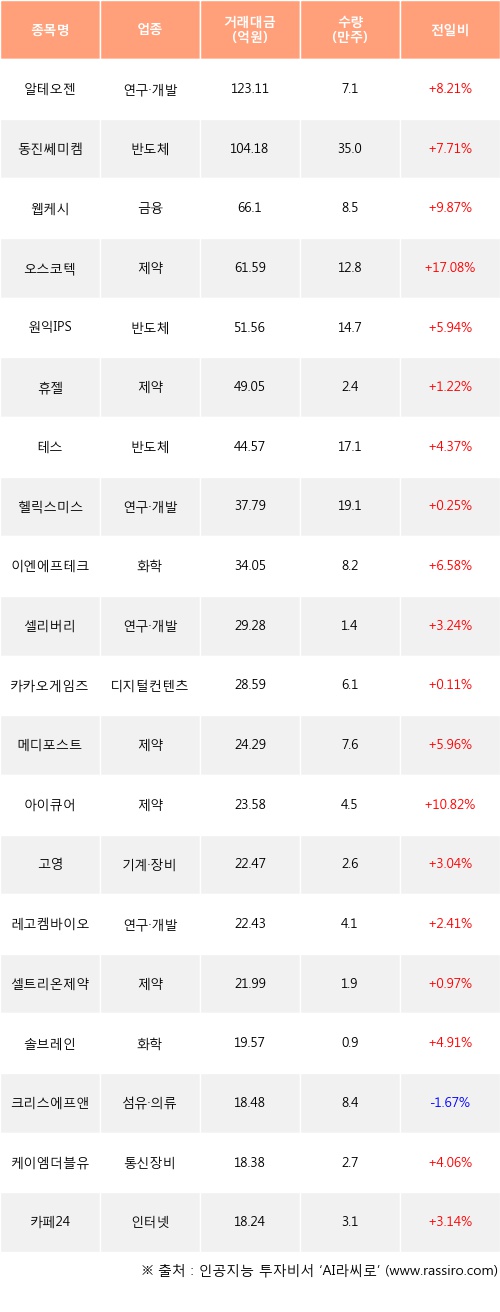 알테오젠, 동진쎄미켐, 웹케시 등은 전일 대비 주가가 상승했고, 크리스에프앤씨 등은 주가가 하락했다.