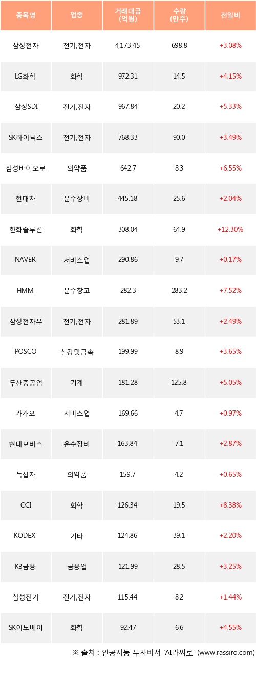 외국인 투자자의 순매수 상위 20개 종목은 삼성전자, LG화학, 삼성SDI, SK하이닉스, 삼성바이오로직스, 현대차, 한화솔루션, NAVER, HMM, 삼성전자우등이다.