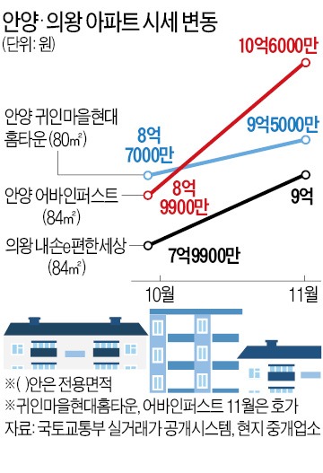 인근 의왕시 일대도 집값 오름세가 조금씩 나타나고 있다. 지난해 11월 입주한 의왕 포일동 인덕원푸르지오엘센트로는 전용 84㎡가 12억5000만원에 호가가 나왔다. 지난 2월 11억9010만원에 거래되며 신고가를 경신했던 주택형이다. 내손동 내손e편한세상 전용 84㎡ 아파트는 이달 9억원에 거래되며 신고가를 새로 썼다. 이달 초까지만 해도 8억5000만원에 호가가 형성돼 있던 타입이다.