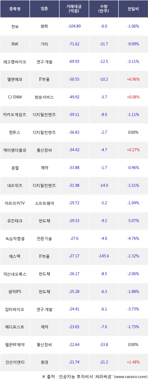 외국인 투자자의 순매도 상위 20개 종목은 천보, SNK, 레고켐바이오, 엘앤에프, CJ ENM, 카카오게임즈, 컴투스, 케이엠더블유, 휴젤, 네오위즈등이다.