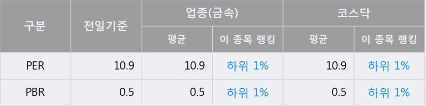 전일 종가를 기준으로 이 종목의 PER는 10.9배, PBR은 0.5배이다. PER는 금속업종의 평균 PER 10.9배와 동일한 수준으로 업종 내에서 하위 1%에 있고, PBR은 금속업종의 평균 PBR 0.5배와 동일한 수준으로 업종 내에서 하위 1%에 위치한다. 보통 낮은 PER는 현재 시장이 해당 기업의 가치를 상대적으로 낮게 평가하고 있다고 해석될 수 있다.