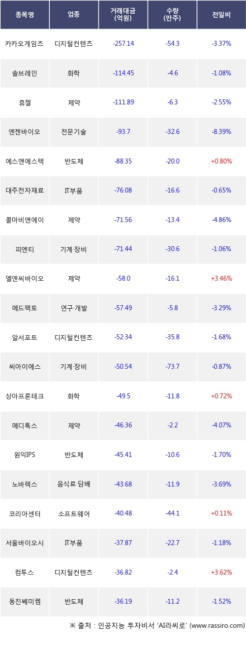 외국인 투자자의 순매도 상위 20개 종목은 카카오게임즈, 솔브레인, 휴젤, 엔젠바이오, 에스앤에스텍, 대주전자재료, 콜마비앤에이치, 피엔티, 엘앤씨바이오, 메드팩토등이다.
