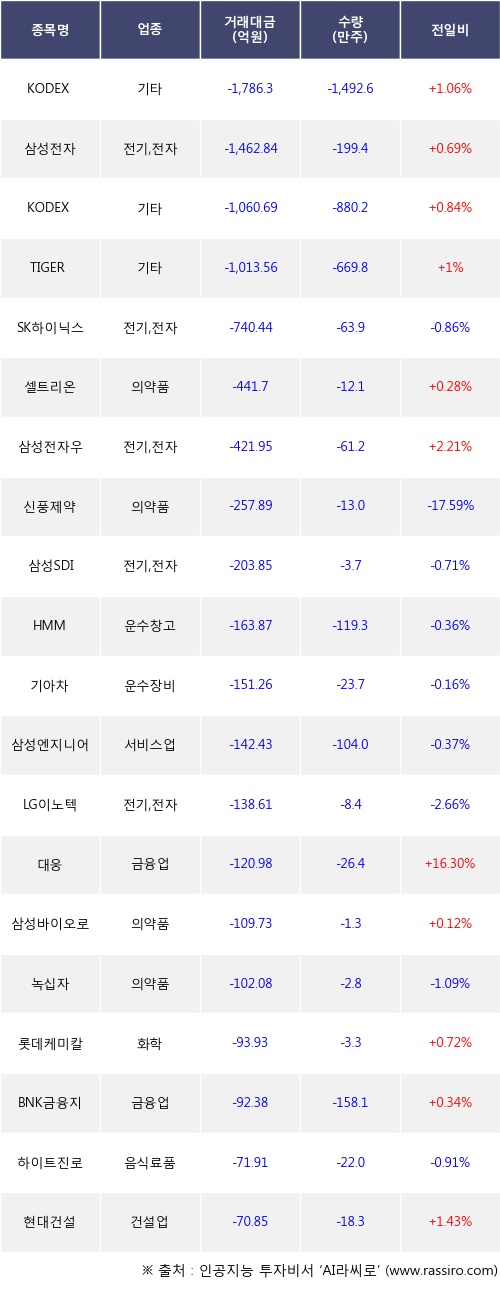 외국인 투자자의 순매도 상위 20개 종목은 KODEX 200TR, 삼성전자, KODEX MSCI Korea TR, TIGER MSCI Korea TR, SK하이닉스, 셀트리온, 삼성전자우, 신풍제약, 삼성SDI, HMM등이다.