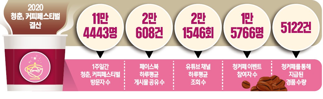 11만4443명. 국내 최초 랜선으로 열린 ‘2020 청춘, 커피페스티벌’에 1주일간 접속한 사람들이다. 지난 7일부터 13일까지 하루평균 2만 명씩 홈페이지를 찾았다. 10일과 11일 진행한 유튜브 라이브 방송은 1만 건 이상의 조회 기록을 세웠다.올해 4회째를 맞이한 ‘청춘, 커피페스티벌’은 한국경제신문사와 서울 송파구가 공동 주최하는 국내 최대 커피문화 축제다. 취업, 시험 등 일상에 지친 청춘들을 위로하기 위해 2017년부터 매년 서울 잠실 롯데월드타워 광장과 석촌호수에서 열렸다. 올해는 신종 코로나바이러스 감염증(코로나19) 영향으로 ‘랜선 페스티벌’로 진행했다. “청춘 커피페스티벌이 온라인으로도 성공을 거뒀다”는 평가가 나왔다.