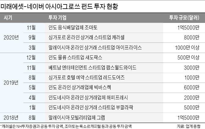 ‘미래에셋-네이버 아시아그로쓰 펀드’는 앞서 지난 9월 싱가포르 스타트업인 캐러셀에 8000만달러(약 868억원)를 투자했다. NH투자증권도 투자에 참여했다. 2012년 설립된 캐러셀은 동남아시아 지역 중심으로 중고 제품 거래를 돕는 플랫폼을 운영하고 있다. 이 지역에서 가장 큰 중고 거래 플랫폼이다.