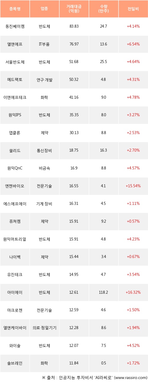 기관 투자자의 순매수 상위 20개 종목은 동진쎄미켐, 엘앤에프, 서울반도체, 메드팩토, 이엔에프테크놀로지, 원익IPS, 앱클론, 쏠리드, 원익QnC, 엔젠바이오등이다.