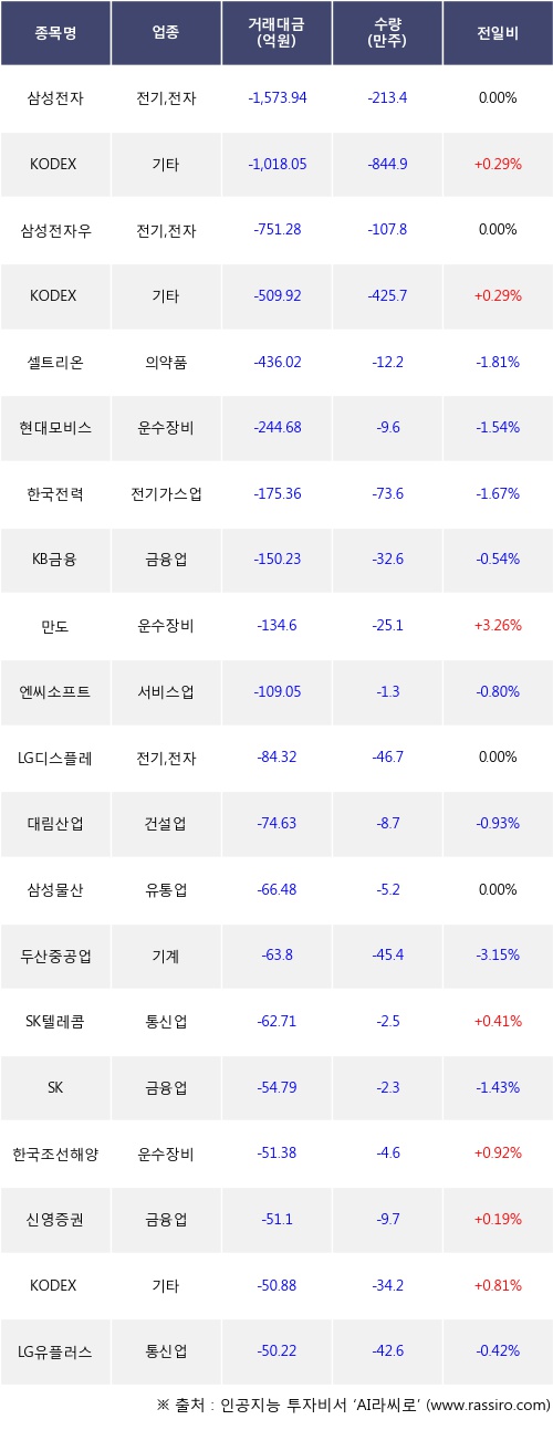 외국인 투자자의 순매도 상위 20개 종목은 삼성전자, KODEX MSCI Korea TR, 삼성전자우, KODEX 200TR, 셀트리온, 현대모비스, 한국전력, KB금융, 만도, 엔씨소프트등이다.