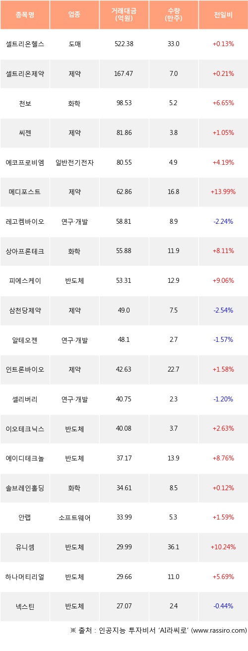 셀트리온헬스케어, 셀트리온제약, 천보 등은 전일 대비 주가가 상승했고, 레고켐바이오, 삼천당제약, 알테오젠 등은 주가가 하락했다.