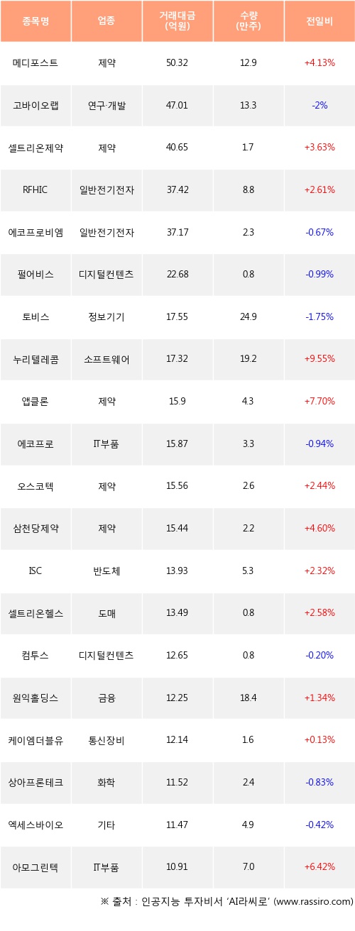 메디포스트, 셀트리온제약, RFHIC 등은 전일 대비 주가가 상승했고, 고바이오랩, 에코프로비엠, 펄어비스 등은 주가가 하락했다.