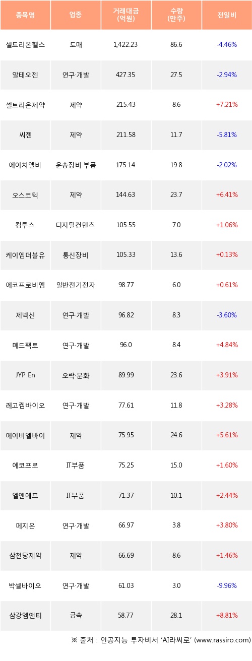 셀트리온제약, 오스코텍, 컴투스 등은 전일 대비 주가가 상승했고, 셀트리온헬스케어, 알테오젠, 씨젠 등은 주가가 하락했다.