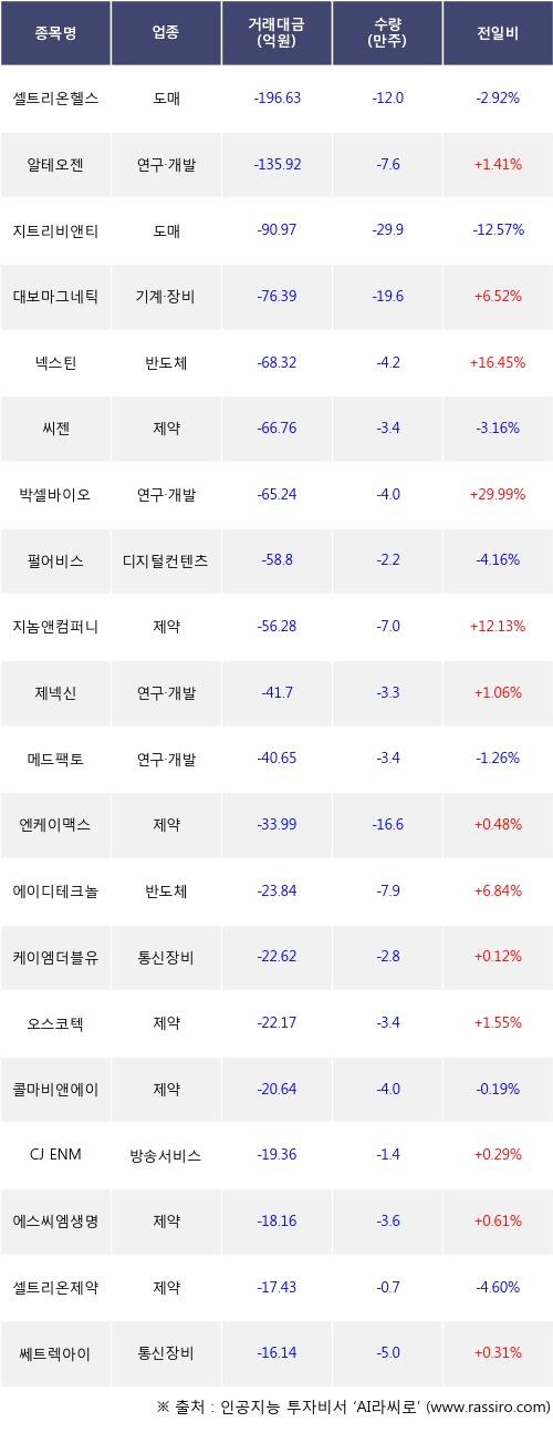 기관 투자자의 순매도 상위 20개 종목은 셀트리온헬스케어, 알테오젠, 지트리비앤티, 대보마그네틱, 넥스틴, 씨젠, 박셀바이오, 펄어비스, 지놈앤컴퍼니, 제넥신등이다.