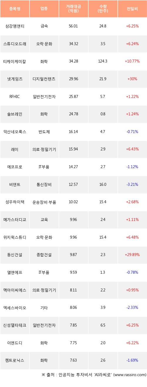 삼강엠앤티, 스튜디오드래곤, 티케이케미칼 등은 전일 대비 주가가 상승했고, 덕산네오룩스, 에코프로, 비덴트 등은 주가가 하락했다.