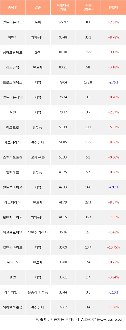 셀트리온헬스케어, 피엔티, 상아프론테크 등은 전일 대비 주가가 상승했고, 프로스테믹스, 인트론바이오, 에이치엘비 등은 주가가 하락했다.
