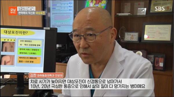 방송에서는 김찬병원에 입원 중인 대상포진 환자의 인터뷰를 통해 대상포진의 통증이 얼마나 심각하고 고통스러운지 잘 보여줬다.