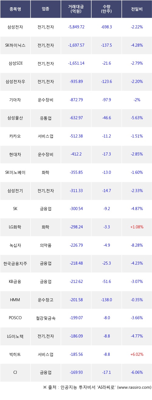 외국인 투자자의 순매도 상위 20개 종목은 삼성전자, SK하이닉스, 삼성SDI, 삼성전자우, 기아차, 삼성물산, 카카오, 현대차, SK이노베이션, 삼성전기등이다.