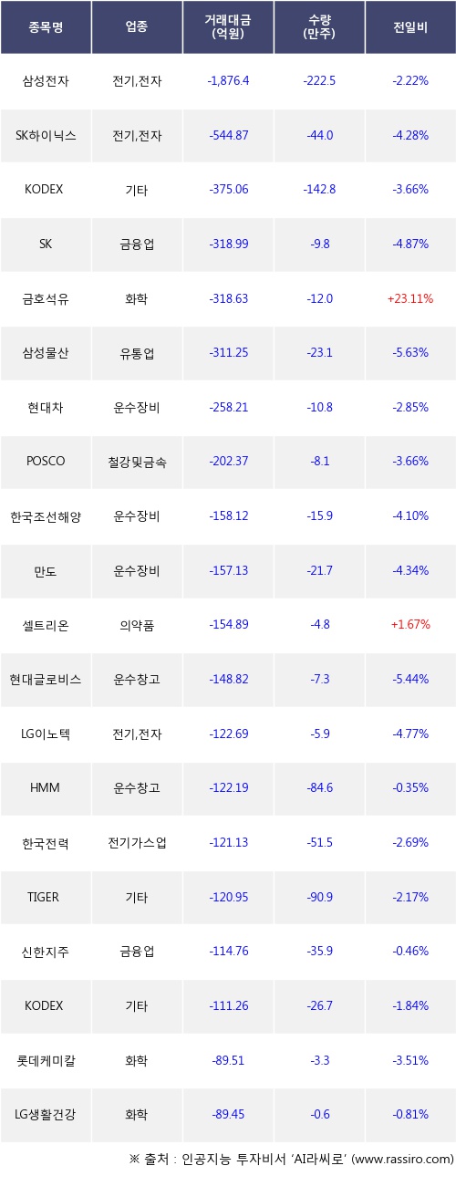 기관 투자자의 순매도 상위 20개 종목은 삼성전자, SK하이닉스, KODEX 레버리지, SK, 금호석유, 삼성물산, 현대차, POSCO, 한국조선해양, 만도등이다.