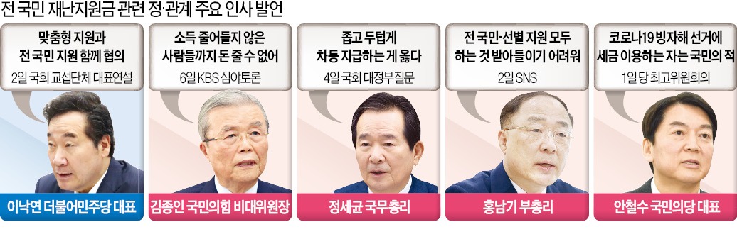 여권 유력 대선주자 중 한 명인 정세균 국무총리도 선별 지원에 보다 무게를 두고 있다. 정 총리는 4일 국회 대정부질문에서 “좁고 두텁게 지원하는 차등 지급을 하는 게 옳다는 생각”이라고 밝혔다. 다만 “경기 부양용일 때는 전 국민에게 지급할 수도 있다”고 여지를 남겼다.