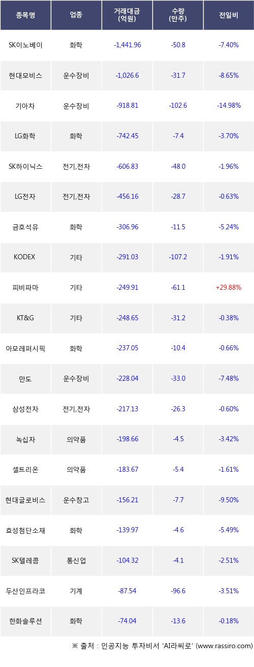 외국인 투자자의 순매도 상위 20개 종목은 SK이노베이션, 현대모비스, 기아차, LG화학, SK하이닉스, LG전자, 금호석유, KODEX 레버리지, 피비파마, KT&G등이다.