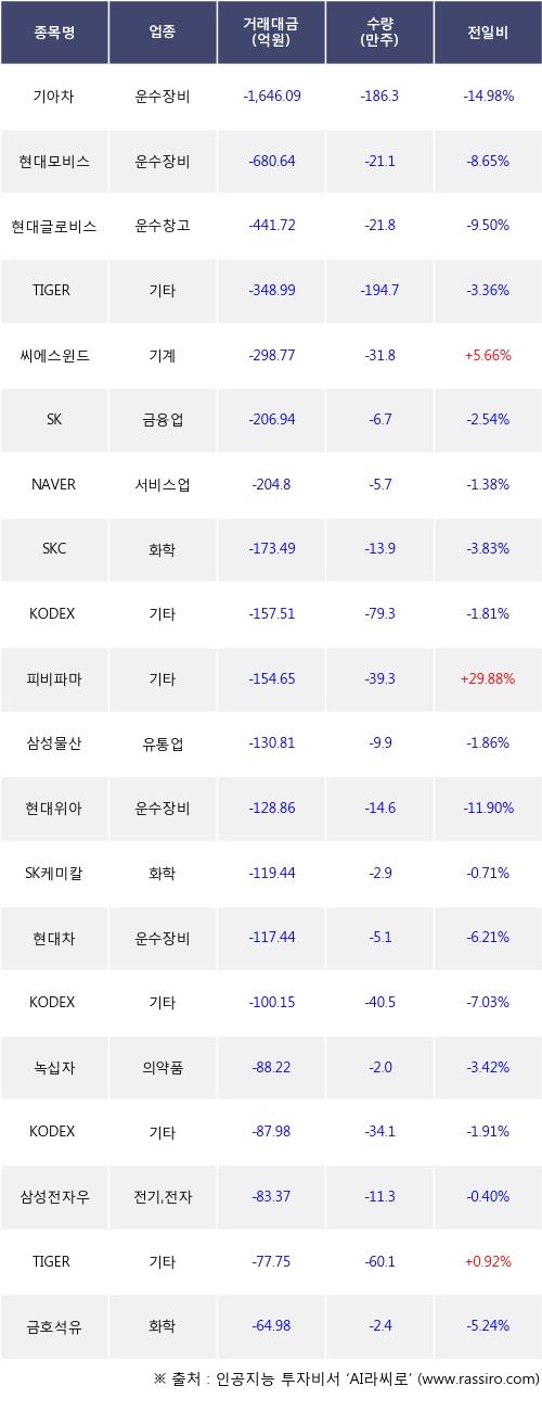 기관 투자자의 순매도 상위 20개 종목은 기아차, 현대모비스, 현대글로비스, TIGER KRX2차전지K-뉴딜, 씨에스윈드, SK, NAVER, SKC, KODEX 2차전지산업, 피비파마등이다.