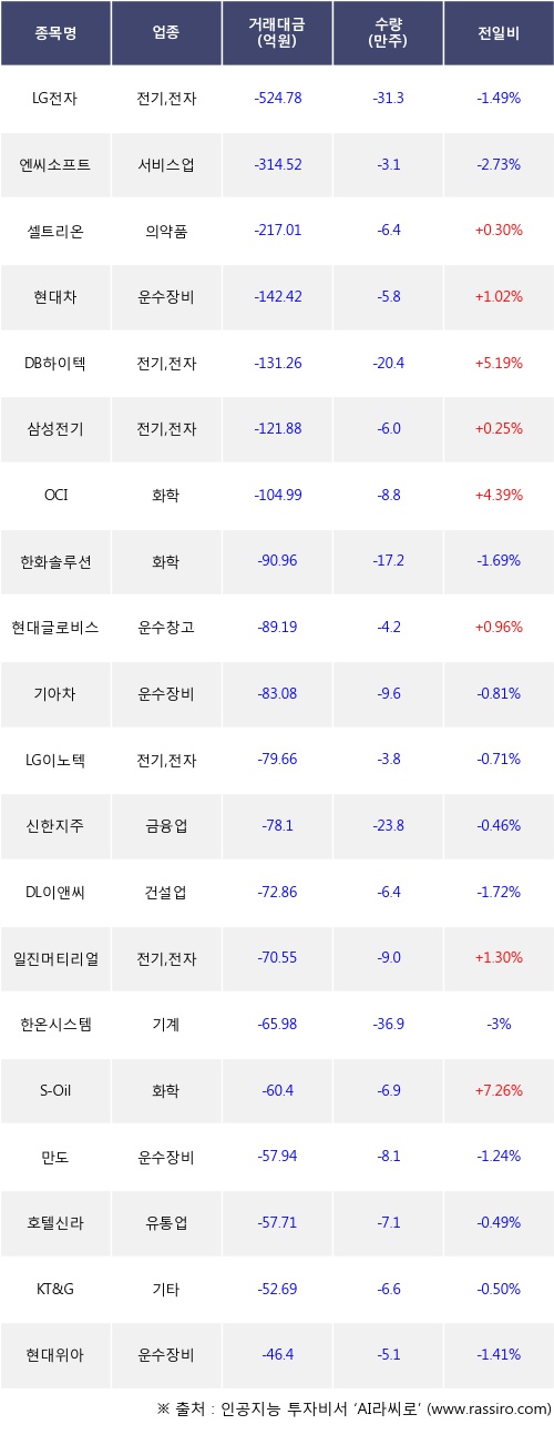 외국인 투자자의 순매도 상위 20개 종목은 LG전자, 엔씨소프트, 셀트리온, 현대차, DB하이텍, 삼성전기, OCI, 한화솔루션, 현대글로비스, 기아차등이다.