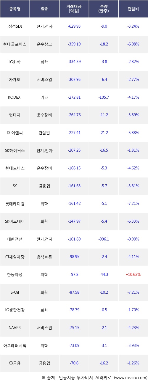 외국인 투자자의 순매도 상위 20개 종목은 삼성SDI, 현대글로비스, LG화학, 카카오, KODEX 레버리지, 현대차, DL이앤씨, SK하이닉스, 현대모비스, SK등이다.