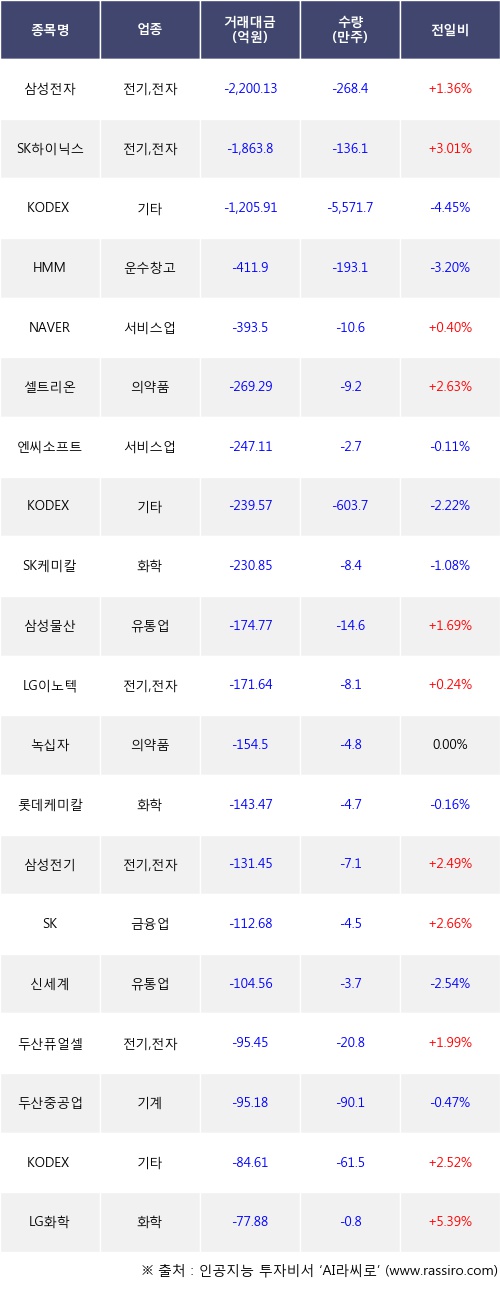 기관 투자자의 순매도 상위 20개 종목은 삼성전자, SK하이닉스, KODEX 200선물인버스2X, HMM, NAVER, 셀트리온, 엔씨소프트, KODEX 인버스, SK케미칼, 삼성물산등이다.
