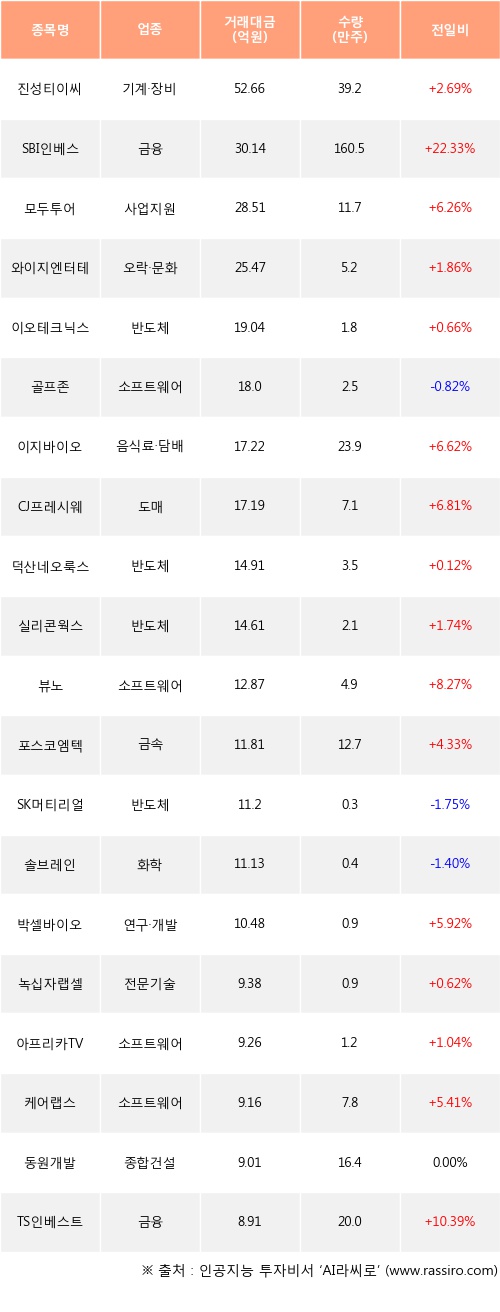 진성티이씨, SBI인베스트먼트, 모두투어 등은 전일 대비 주가가 상승했고, 골프존, SK머티리얼즈, 솔브레인 등은 주가가 하락했다.