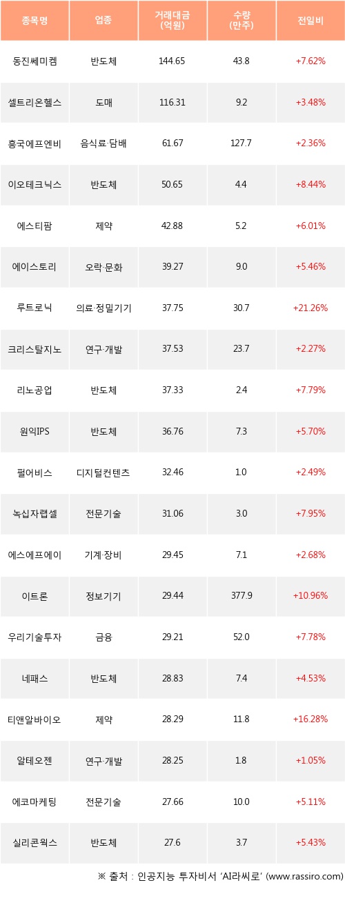 기관 투자자의 순매수 상위 20개 종목은 동진쎄미켐, 셀트리온헬스케어, 흥국에프엔비, 이오테크닉스, 에스티팜, 에이스토리, 루트로닉, 크리스탈지노믹스, 리노공업, 원익IPS등이다.