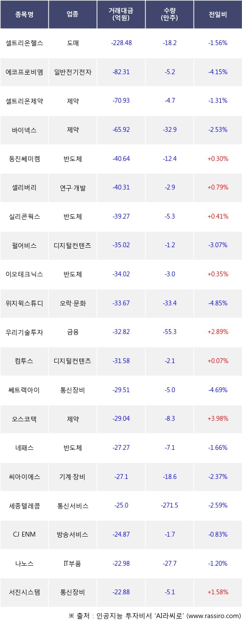 외국인 투자자의 순매도 상위 20개 종목은 셀트리온헬스케어, 에코프로비엠, 셀트리온제약, 바이넥스, 동진쎄미켐, 셀리버리, 실리콘웍스, 펄어비스, 이오테크닉스, 위지윅스튜디오등이다.