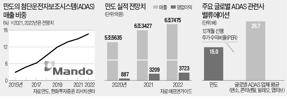 15배인 PER도 글로벌 ADAS 업체에 비하면 낮은 수준이다. 한화투자증권에 따르면 덴소(Denso), 콘티넨탈(Continental), 발레오(Valeo), 앱티브(Aptiv) 등 글로벌 ADAS 업체의 12개월 선행 PER 평균은 26.7배다. 신한금융투자도 전장부품사의 평균 PER을 40배로 계산했다. 정용진 신한금융투자 연구원은 “만도의 목표 PER은 25배, 이에 따른 목표주가는 9만5000원”이라고 설명했다. 키움증권과 이베스트투자증권은 만도의 목표주가를 각각 10만원, 11만원으로 제시했다.