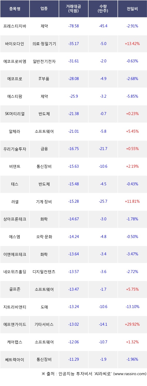 기관 투자자의 순매도 상위 20개 종목은 프레스티지바이오로직스, 바이오다인, 에코프로비엠, 에코프로, 에스티팜, SK머티리얼즈, 알체라, 우리기술투자, 비덴트, 테스등이다.