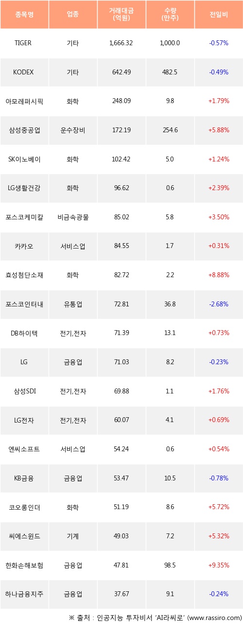 아모레퍼시픽, 삼성중공업, SK이노베이션 등은 전일 대비 주가가 상승했고, TIGER MSCI Korea TR, KODEX 200TR, 포스코인터내셔널 등은 주가가 하락했다.