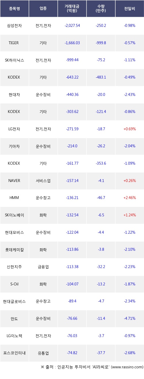 기관 투자자의 순매도 상위 20개 종목은 삼성전자, TIGER MSCI Korea TR, SK하이닉스, KODEX 200TR, 현대차, KODEX 레버리지, LG전자, 기아차, KODEX 코스닥150선물인버스, NAVER등이다.